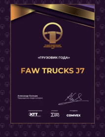 В рамках выставки COMVEX прошло награждение победителей конкурса «Лучший коммерческий автомобиль года в России». Организатор конкурса — журнал «Коммерческий транспорт и технологии», команда которого ежегодно проводит голосование среди читателей журнала и профильных жюри. По результатам оценки тягачи FAW TRUCKS J7 стали победителями в номинации «Грузовик года»!